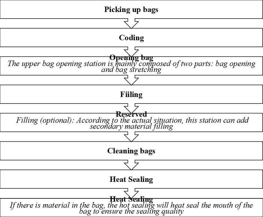 3. La gama de embalaje de la máquina es amplia. Para película compuesta multicapa, PE de capa única, PP hecho de bolsas prefabricadas, se pueden usar bolsas de papel. El patrón de bolsa de embalaje acabado es perfecto, la calidad de sellado es buena y el grado es alto.